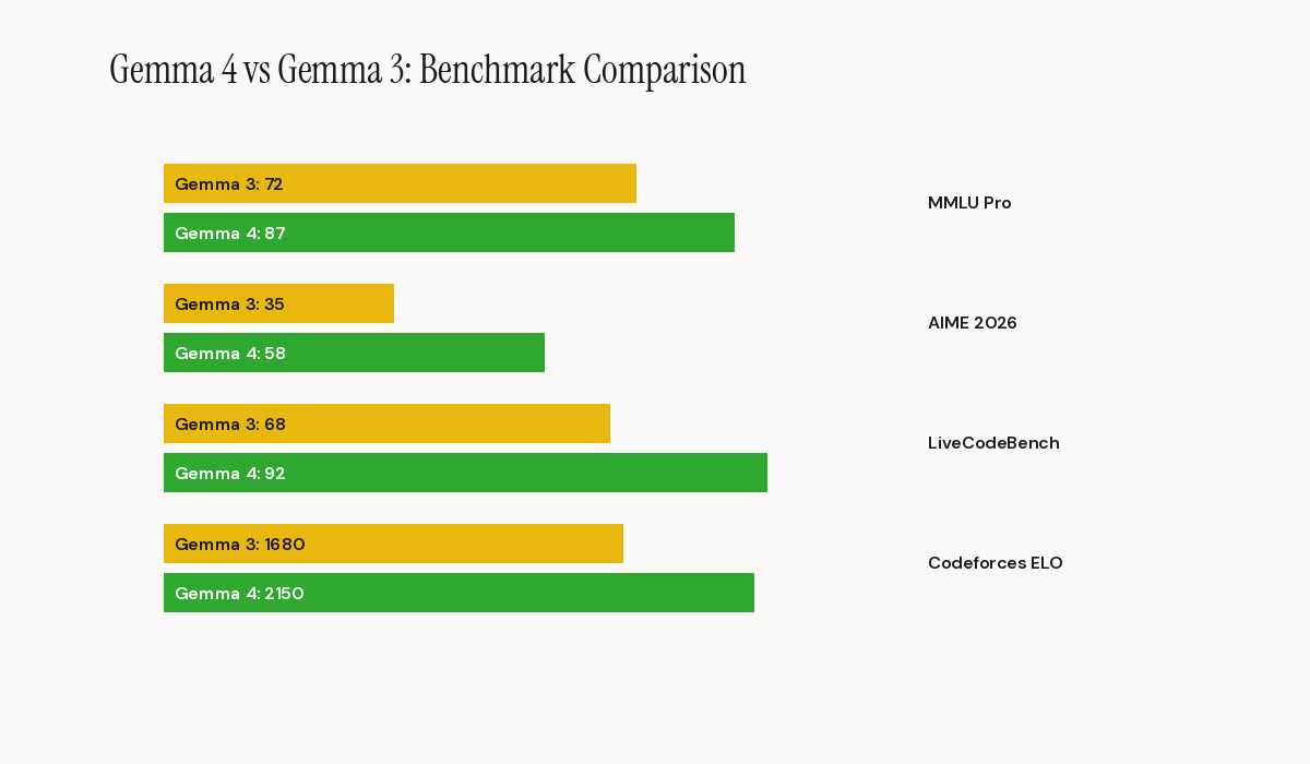 En programmation, le 31B obtient un ELO Codeforces de 2150 et 80,0 % sur LiveCodeBench v6. Pour mettre ces chiffres en perspective, Gemma 3 27B plafonnait à 110 en ELO Codeforces et 29,1 % sur LiveCodeBench. Le saut de performance est d'un ordre de grandeur.