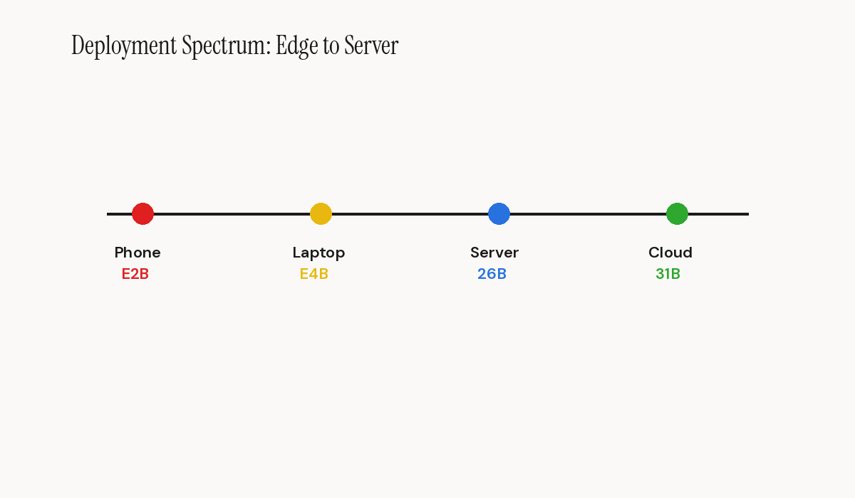 La famille Gemma 4 se décline en quatre tailles qui ciblent des cas d'usage distincts. Cette segmentation n'est pas anodine : elle reflète la conviction de Google que l'IA de demain ne sera pas uniquement dans le cloud.