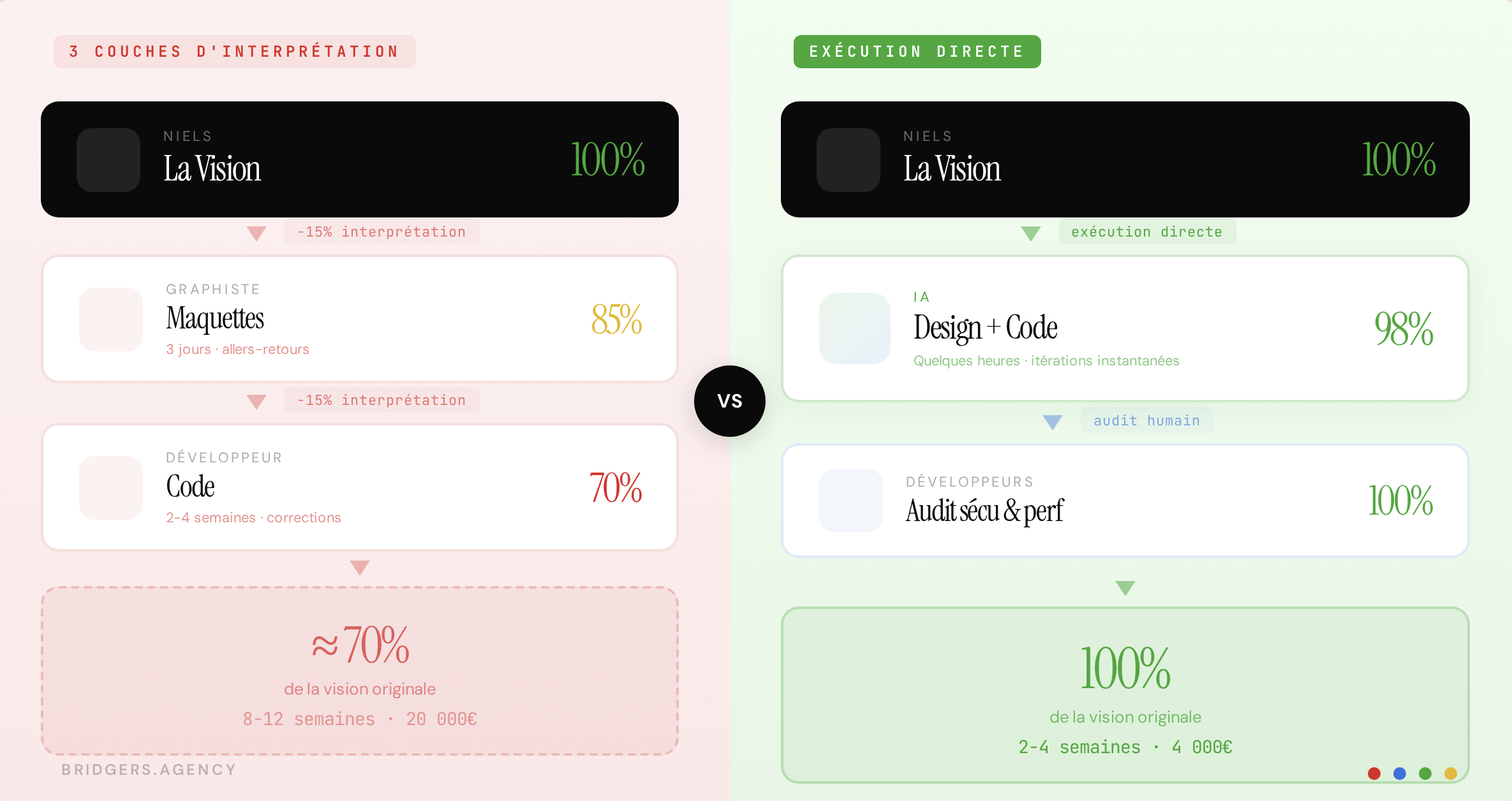 Je m'appelle Niels, et ça fait 7 ans que je dirige Bridgers. À l'origine, on est une agence de développement web, mobile et design. Pendant toutes ces années, j'ai toujours été celui qui porte la vision : le copywriting, l'identité visuelle, l'architecture des pages, le positionnement de chaque élément. Mais pour transformer cette vision en réalité, j'ai toujours eu besoin de deux personnes : un graphiste pour le design, et un développeur pour le code.