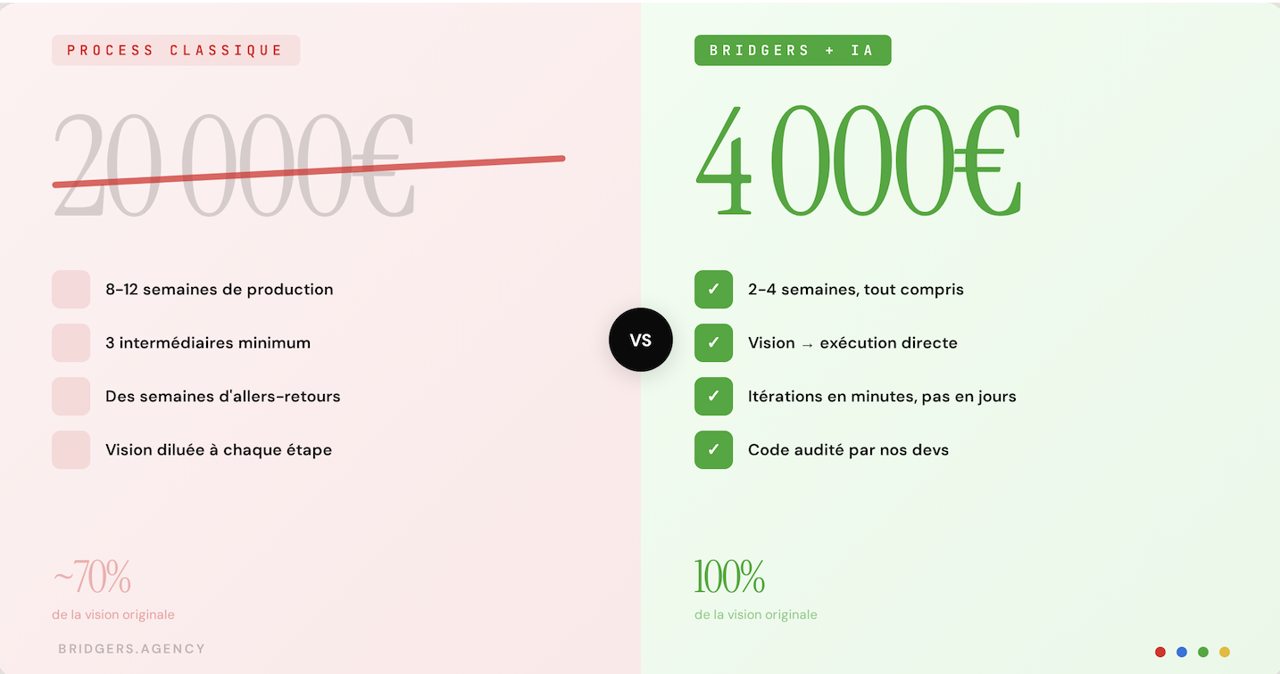 Aujourd'hui, cette équation a changé. Le site que vous êtes en train de lire bridgers.agency a été entièrement codé avec l'IA. Et ce n'est pas un prototype. C'est notre vitrine, en production, avec de vrais clients qui la visitent chaque jour.