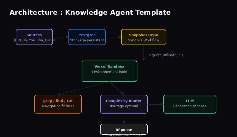Vercel Labs a publié le Knowledge Agent Template en mars 2026, une approche radicalement différente. Au lieu d'embeddings et de bases vectorielles, l'agent utilise des commandes unix (grep, find, cat) dans un sandbox isolé pour chercher dans les fichiers sources. C'est un retour aux fondamentaux qui mérite une analyse stratégique approfondie.
