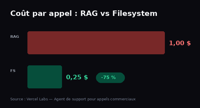 Coût récurrent. Le RAG implique l'hébergement de la base vectorielle, la re-vectorisation lors des mises à jour, les appels au modèle d'embedding et les appels au LLM de génération. L'approche filesystem implique uniquement le stockage Postgres, les Vercel Sandboxes et les appels au LLM.