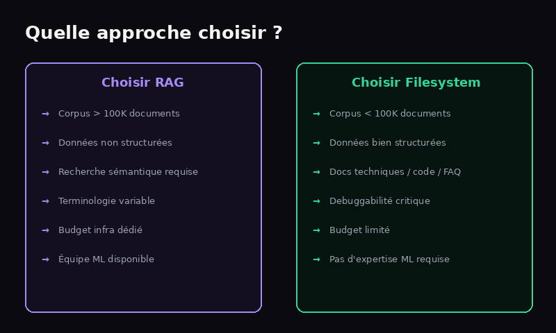 Maintenance. Le RAG demande une expertise en machine learning pour le tuning des embeddings et des paramètres de retrieval. L'approche filesystem demande une compréhension basique des outils unix et de la structure de fichiers.