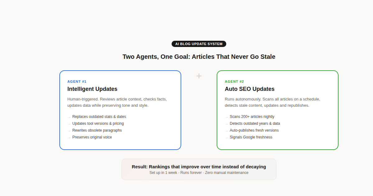 We built two AI agents to fix this. One that updates your articles on demand, the other that does it automatically, every single day.